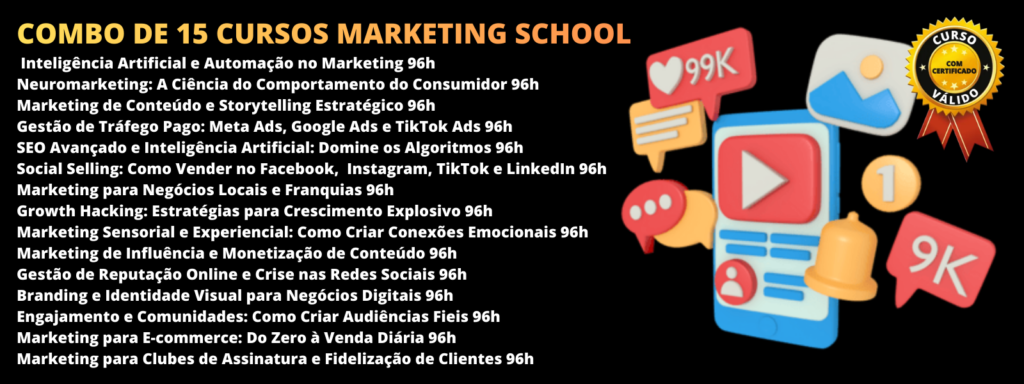 COMBO DE 15 CURSOS MARKETING SCHOOLInteligência Artificial e Automação no Marketing 96hNeuromarketing: A Ciência do…